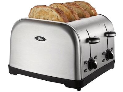 Oster brushed stainless steel 4 slice toaster a true performer with advanced toasting technology the four slice toaster features extra wide slots that can accommodate anything from bagels and thick slices of homemade bread to english muffins sandwich bread tea cakes and more.